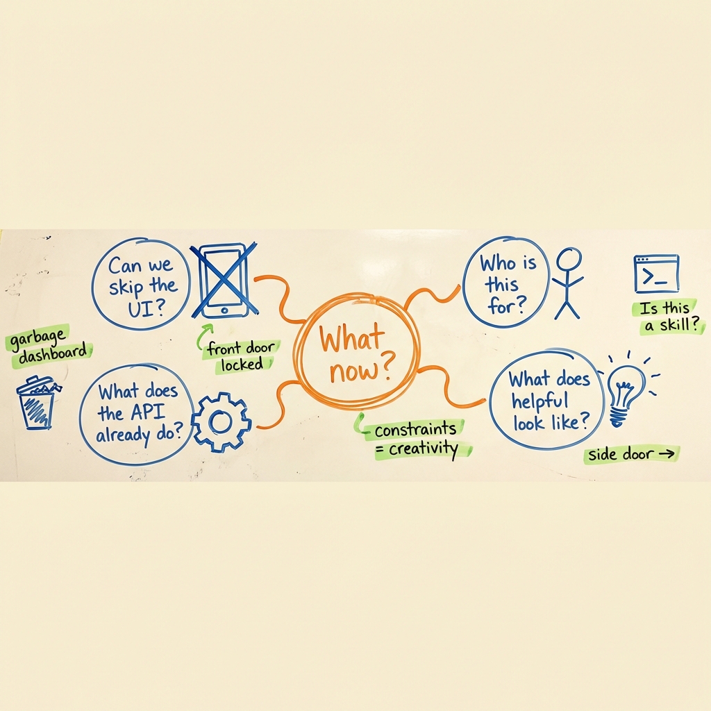 Ruthless prioritization gets talked about like it's just saying no to things. That's part of it, sure. But the harder part is spotting the side door when the front door is locked. The garbage dashboard can't be fixed on this timeline, but the API underneath it works fine. A skill that wraps the API isn't a compromise. It's the same outcome through a different path.